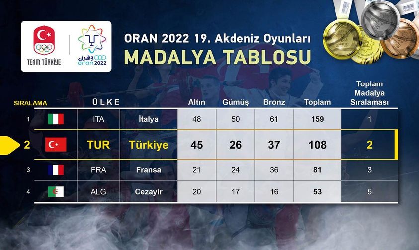 Oran’da, İtalya toplam 159 madalyayla birinci olurken, 81 madalya kazanan Fransa üçüncülük elde etti.