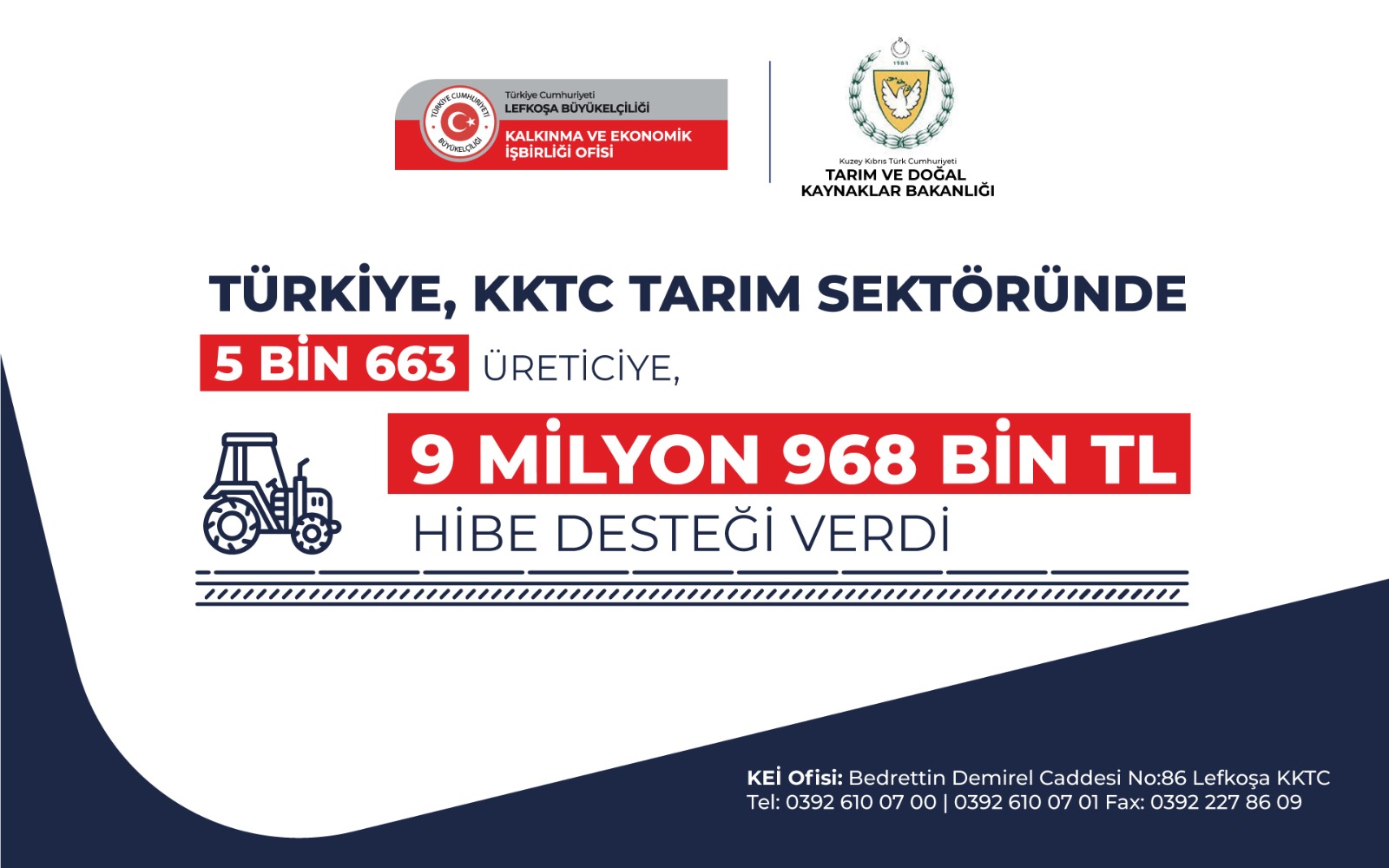 Türkiye Cumhuriyeti Hükümeti ve Kuzey Kıbrıs Türk Cumhuriyeti Hükümeti arasında imzalanan 2021 Yılı İktisadi ve Mali İşbirliği Anlaşması uyarınca, KKTC Tarım ve Doğal Kaynaklar Bakanlığı’nın belirlediği kriterler üzerinden, tarım sektöründe faaliyet gösteren ve salgından olumsuz etkilendiği değerlendirilen bitkisel ürün üreticisi, balıkçı ve arıcılara, hibe şeklinde 9 milyon 968 TL salgın destek ödemesi yapıldı.