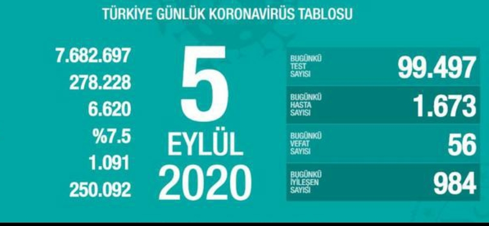 Türkiye Günlük Koronavirüs Tablosu, “covid19.saglik.gov.tr” adresinden paylaşıldı. Güncel verilere göre, bugün 99 bin 497 test yapıldı, 1673 kişide COVID-19 tespit edildi.