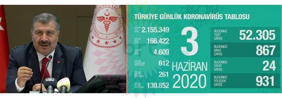 TC Sağlık Bakanı Fahrettin Koca, Türkiye'nin en son corona virüs rakamlarını paylaştı. Tabloya göre son 24 saatte 24 kişi hayatını kaybederken 867 yeni vaka tespit edildi. Toplam can kaybı 4 bin 609'a yükselirken, 931 Covid-19 hastası da iyileşti.