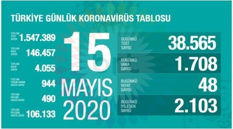 Türkiye'de son 24 saatte 1708 yeni vaka tespit edildi, 48 kişi daha hayatını kaybetti. İyileşenlerin sayısı ise 2 bin 103 artarak 106 bin 133 yükseldi.