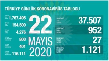 Türkiye'de son 24 saatte 952 yeni vaka tespit edildi, 27 kişi daha hayatını kaybetti. İyileşenlerin sayısı ise 1121 artarak 116 bin 111'e yükseldi.