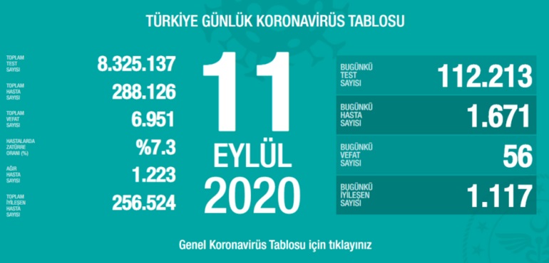 Türkiye’de son 24 saatte 1671 yeni vaka tespit edildi, 56 kişi hayatını kaybetti. İyileşenlerin sayısı ise 1117 artarak 256 bin 524’e yükseldi.