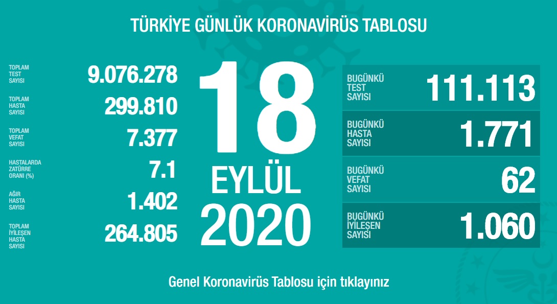 Türkiye’de son 24 saatte 1771 yeni vaka tespit edildi, 62 kişi hayatını kaybetti. İyileşenlerin sayısı ise 1060 artarak 264 bin 805’e yükseldi.