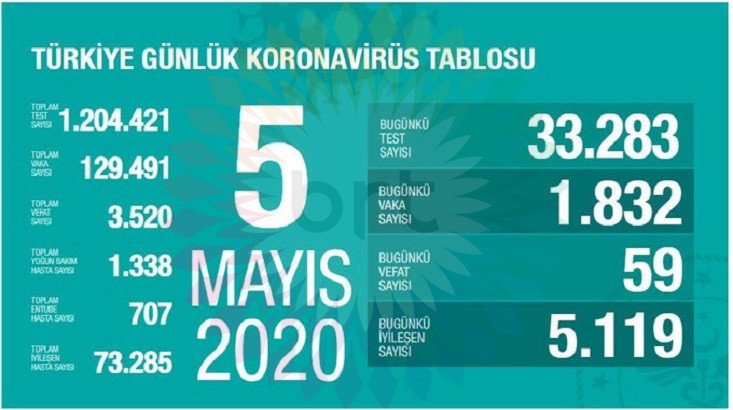 Son 24 saatte 59 hasta vefat etti, 5 bin 119 hasta iyileşti. Toplam test sayısı 1 milyon 204 bin 421, toplam vaka sayısı 129 bin 491 ve toplam vefat sayısı 3 bin 520 oldu.