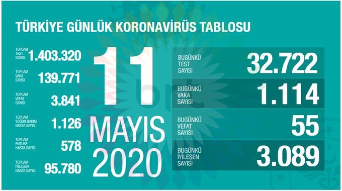 Son 24 saatte 55 hasta vefat etti, 3 bin 89 hasta ise iyileşti. Toplam test sayısı 1 milyon 403 bin 320, toplam vaka sayısı 139 bin 771, toplam vefat sayısı 3 bin 841, toplam yoğun bakım hasta sayısı 1126, toplam entübe hasta sayısı 578, toplam iyileşen hasta sayısı 95 bin 780 oldu.
