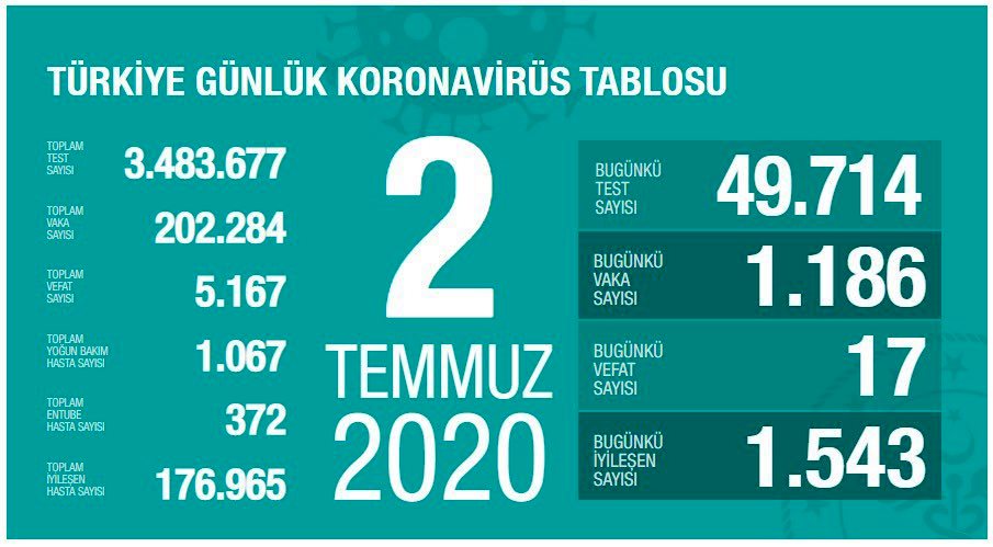 Türkiye'de son 24 saatte 1186 kişiye daha COVID-19 tanısı kondu, 17 kişi hayatını kaybetti. 1543 kişinin daha COVID-19 tedavisinin tamamlanmasıyla, toplam iyileşen hasta sayısı 176 bin 965'e yükseldi.