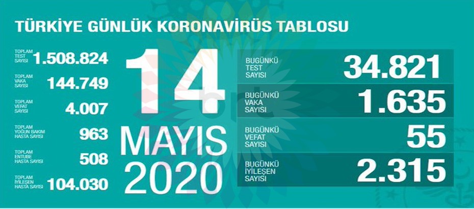 Son 24 saatte 55 hasta vefat etti, 2 bin 315 hasta ise iyileşti. Toplam test sayısı 1 milyon 508 bin 824, toplam vaka sayısı 144 bin 749 ve toplam vefat sayısı 4 bin 7'ye ulaştı. Toplam yoğun bakımdaki hasta sayısı 963, solunum cihazına bağlı hasta sayısı 508, iyileşen hasta sayısı 104 bin 30 oldu.