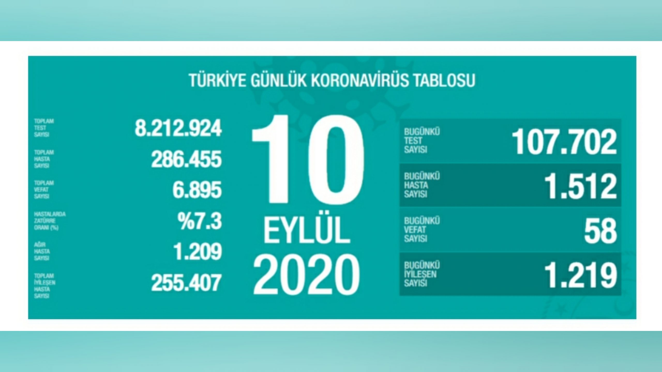 Türkiye’de son 24 saatte 1512 yeni vaka tespit edildi, 58 kişi hayatını kaybetti. İyileşenlerin sayısı ise 1219 artarak 255 bin 407’ye yükseldi.