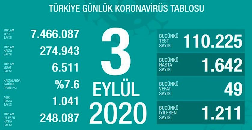 Sağlık Bakanlığının internet sitesinde yer alan ve Bakan Fahrettin Koca’nın da Twitter’dan paylaştığı, “Türkiye Günlük Koronavirüs Tablosu”nun güncel verilerine göre, bugün 110 bin 225 test yapıldı, 1642 kişiye Covid-19 tanısı konuldu.