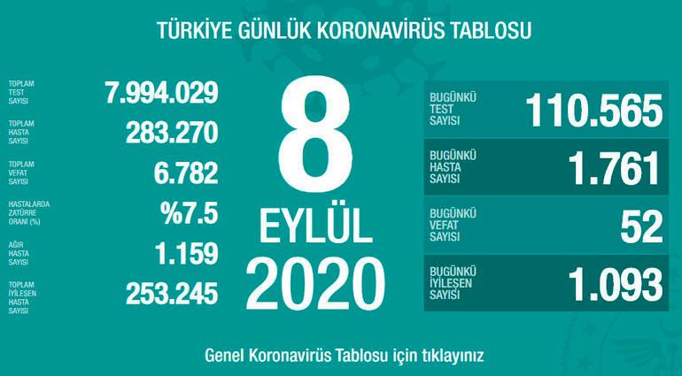 TC Sağlık Bakanı Fahrettin Koca, Twitter hesabından, “Bugün 110 binden fazla test yapıldı ve 1761 yeni hasta tespit edildi. Ağır hasta sayımız artmaya devam ediyor. Kayıplarımız can yakıyor. Bu durumu durduracak olan, birlikte tedbirlere uymaktır. Güç birlikte tedbirde.” değerlendirmesinde bulundu.