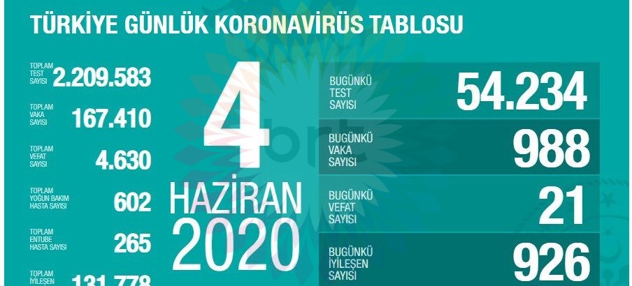 Türkiye'de 24 saatte 988 kişiye COVID-19 tanısı kondu, 21 kişi hayatını kaybetti, toplam vaka sayısı 167 bin 410, can kaybı 4 bin 630 oldu. Son 24 saatte 926 kişinin daha iyileşmesiyle tedavisi tamamlananların sayısı 131 bin 778 oldu.