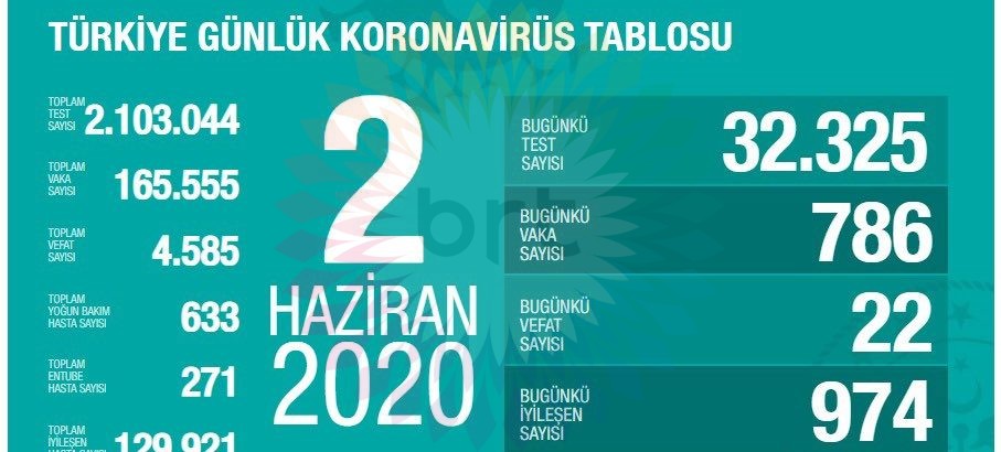 Türkiye'de son 24 saatte 786 kişiye koronavirüs tanısı konuldu, 22 kişi hayatını kaybetti, toplam vaka sayısı 165 bin 555, can kaybı 4 bin 585, iyileşen hasta sayısı 129 bin 921 oldu.