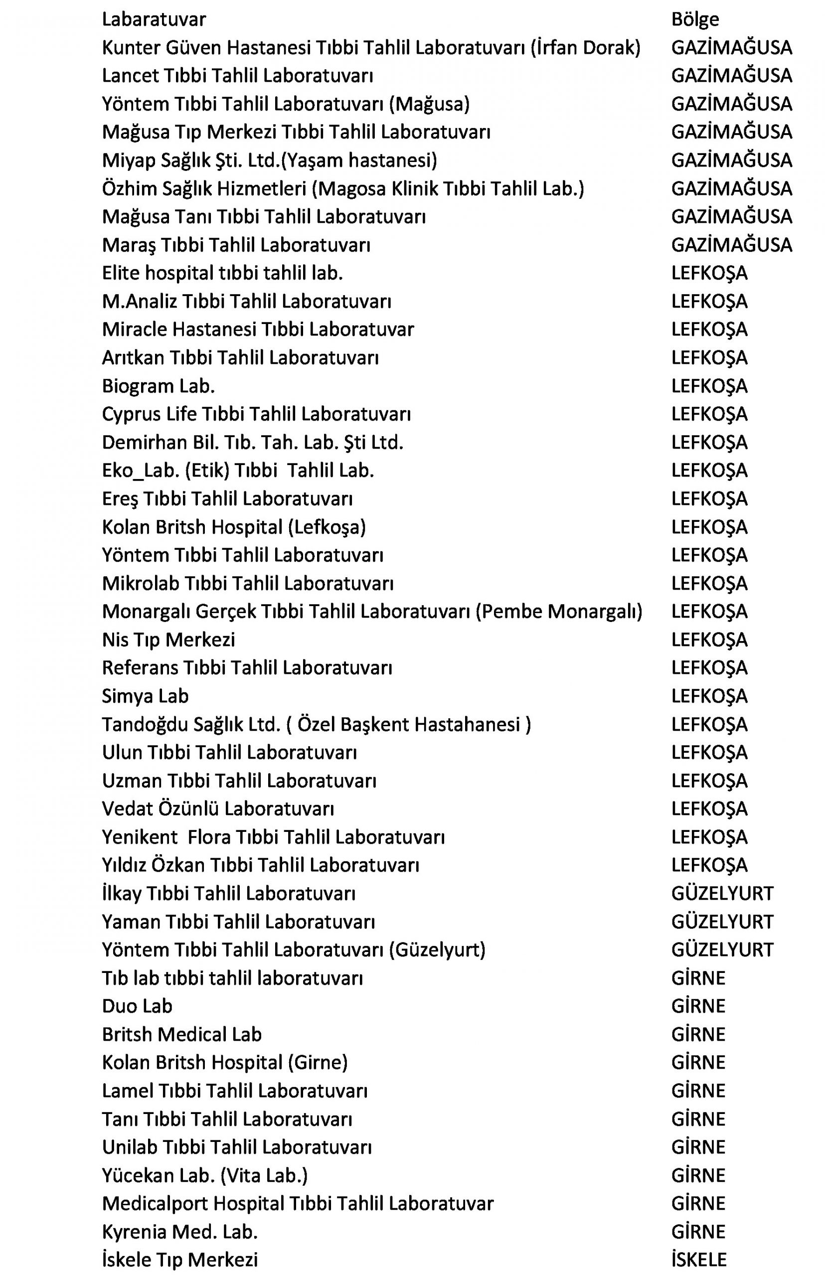 Bakanlığın anlaşmalı olduğu özel laboratuvarların listesi şöyle açıklandı: