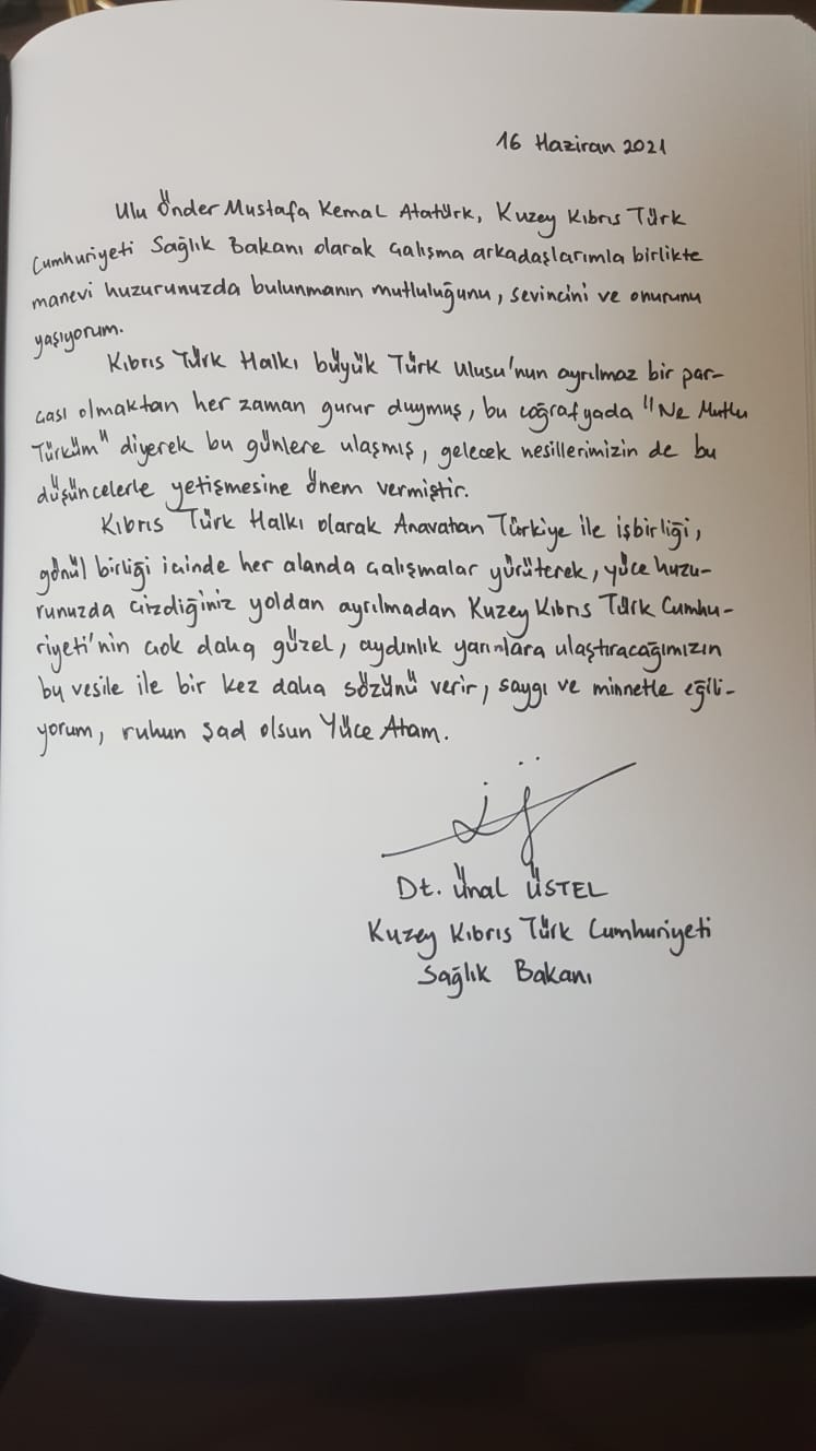 Kıbrıs Türk Halkı olarak Anavatan Türkiye ile iş ve gönül birliği içinde her alanda çalışmalar yürütme, çizdiğiniz yoldan ayrılmadan Kuzey Kıbrıs Türk Cumhuriyeti’ni çok daha güzel aydınlık yarınlara ulaştıracağımıza bir kez daha söz veriyoruz. Saygı ve minnetle huzurunuzda eğiliyoruz”