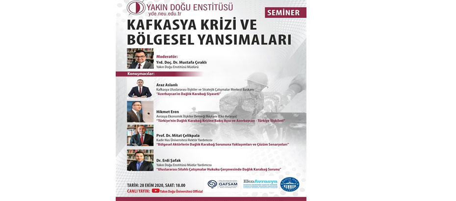 YDÜ açıklamasına göre, 2020-2021 Akademik Yılı Güz dönemi boyunca çevrim içi gerçekleştirilecek seminerlerde, alanında uzman üst düzey bürokrat, diplomat ve akademisyenler küresel konuları irdeleyecek. Moderatörlüğünü Yakın Doğu Enstitüsü Müdürü Yrd. Doç. Dr. Mustafa Çıraklı’nın yapacağı seminerlerin ilki, 28 Ekim 2020 Çarşamba günü 18.00’den itibaren, “Kafkasya Krizi ve Bölgesel Yansımaları” başlığı altında yapılacak.