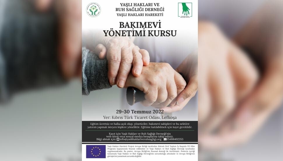Yaşlı Hakları ve Ruh Sağlığı Derneği, 29-30 Temmuz’da 2 gün sürecek bakımevi yönetimi kursu düzenleyecek.