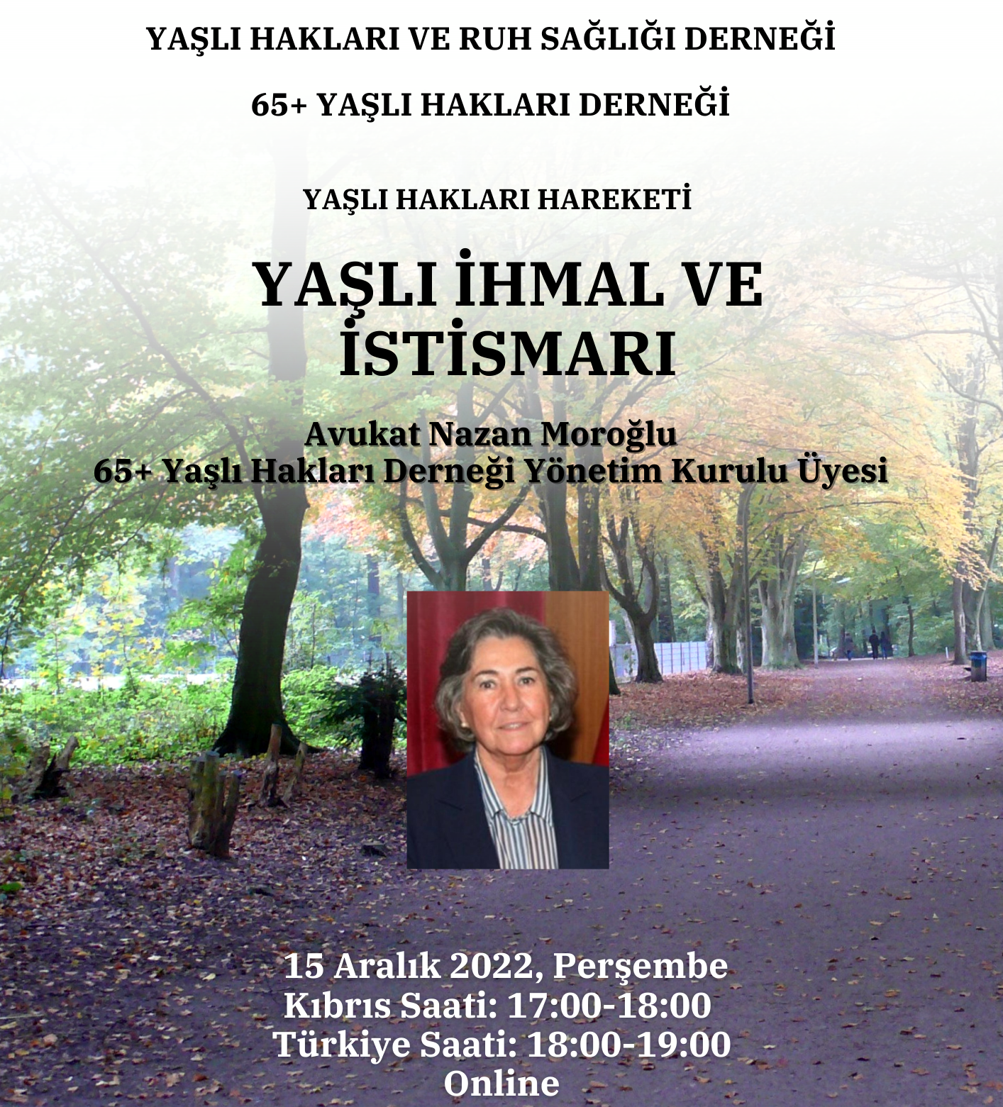 Yaşlı Hakları ve Ruh Sağlığı Derneği ile Türkiye’de bulunan 65+ Yaşlı Hakları Derneği iş birliğinde “Yaşlı İhmal ve İstismarı” başlıklı bir online seminer düzenliyor.