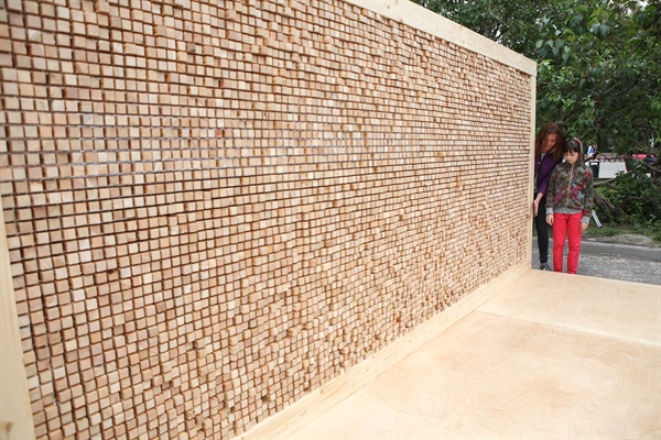 “Enstalasyon, bir plexiglas çerçeveden ve çerçevenin içindeki, üzerlerine alıntıların orijinal dillerinde çevirileriyle birlikte kazındığı binlerce küçük ahşap bloktan oluşuyor. Enstalasyonun açılışından sonra, oradan geçenler bir blok alıp beraberlerinde götürebilecekler. Alıntı-bloklarının yavaş yavaş alınmasıyla, duvardan geriye, blokları bir arada tutan plexiglas şeffaf çerçeve kalacak: duvar yok olacak. Bu süreç, toplulukları, halkları ve sıradan insanları birbirinden ayıran, kendimizin inşa ettiği duvarların, eğer hep birlikte uğraş verirsek yok olabileceklerini sembolize etmektedir.”