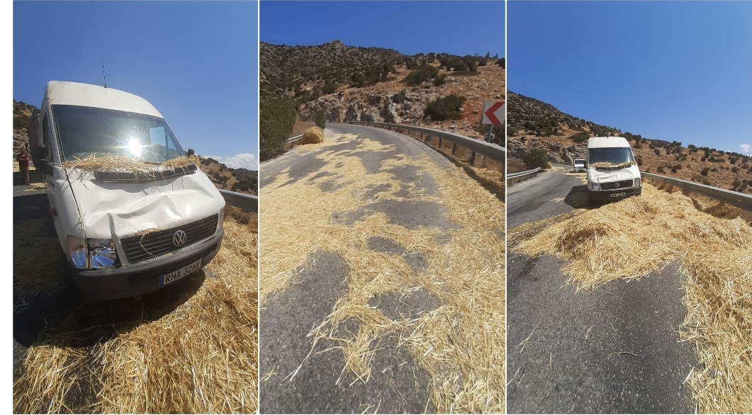 Polis Basın Subaylığı’ndan verilen bilgiye göre bugün saat 11:30 sıralarında, Girne- Değirmenlik Anayolunun (Dağyolu) 6-7’nci km’leri arasında, Mustafa YELTEKİN (E-31), yönetimindeki TKZ 773 plakalı balya yüklü tır araç ile Girne istikametine doğru seyrettiği sırada sola meyilli viraja geldiği zaman üzerinde yüklü bulunan balyalardan 3 tanesi yola düşerek o esnada karşı istikametten gelmekte olan Cemali Özyakup (E-51) yönetimindeki RHA 3268 plakalı araca çarpmıştır.