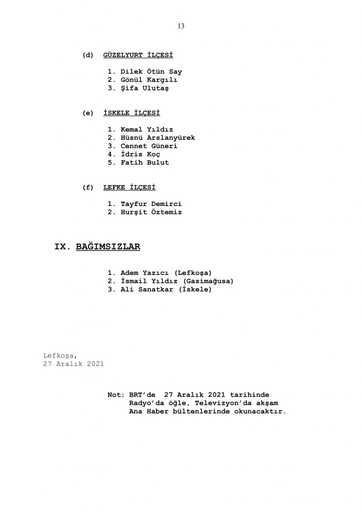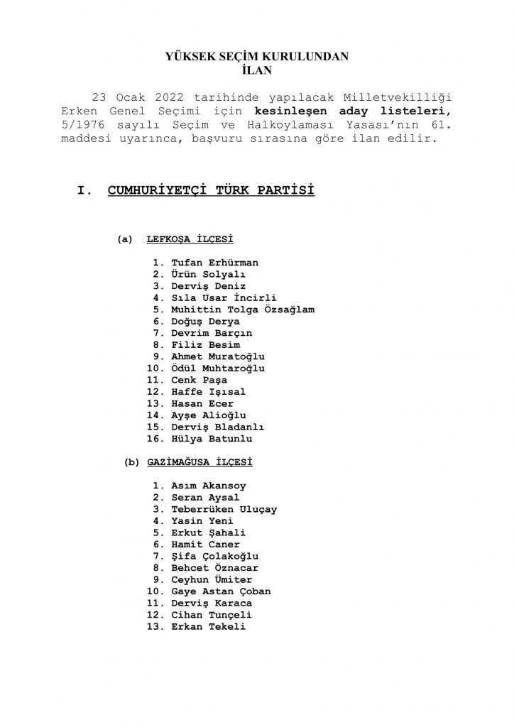 YSK, 23 Ocak 2022 tarihinde yapılacak Milletvekilliği Erken Genel Seçimi için kesinleşen aday listelerini 5/1976 sayılı Seçim ve Halkoylaması Yasası’nın 61’inci maddesi uyarınca başvuru sırasına göre ilan etti.