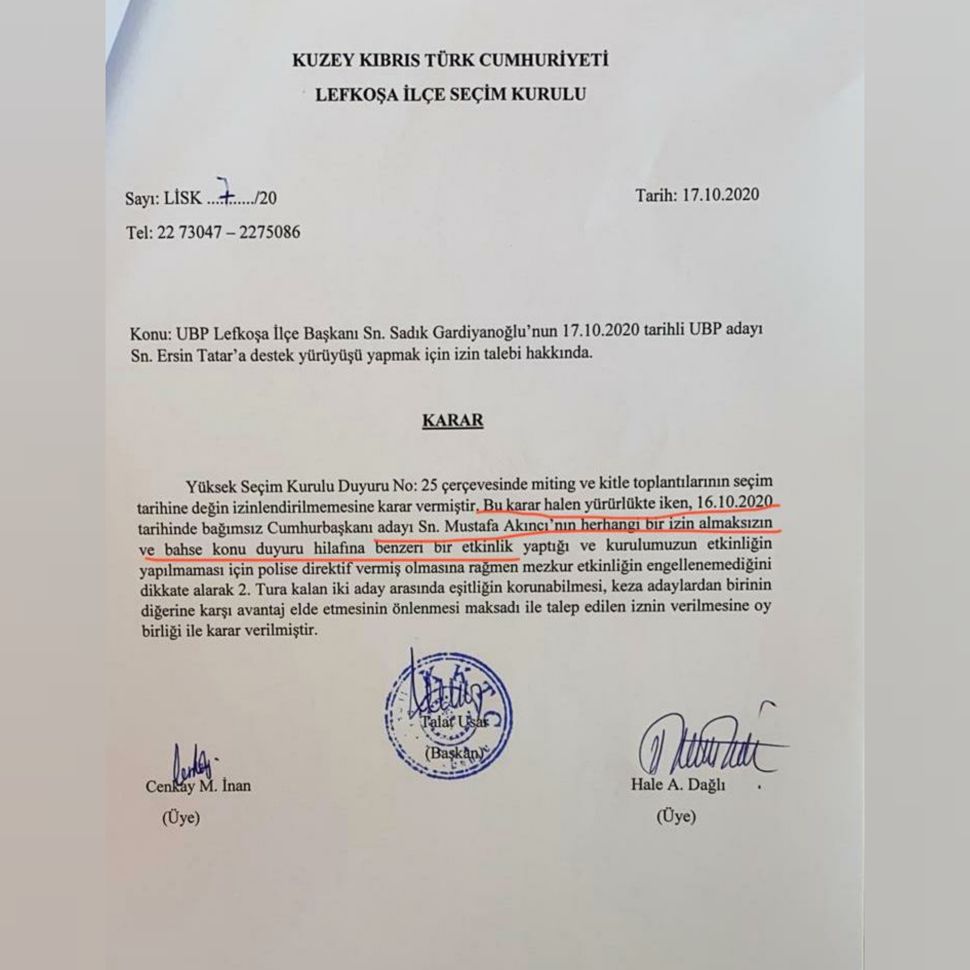 UBP’nin Lefkoşa İlçe Başkanı’nın Tatar’a destek yürüyüşü yapılması için izin talebinde bulunmasının ardından kararı açıklayan YSK, Koronavirüs sebebiyle, “miting ve kitle toplantılarının seçim tarihine kadar izinlendirilmemesi” yönündeki karara karşın, Bağımsız aday Mustafa Akıncı’nın dün Dereboyu’nda, YSK’dan izin almaksızın etkinlik yaptığı ifade edildi.