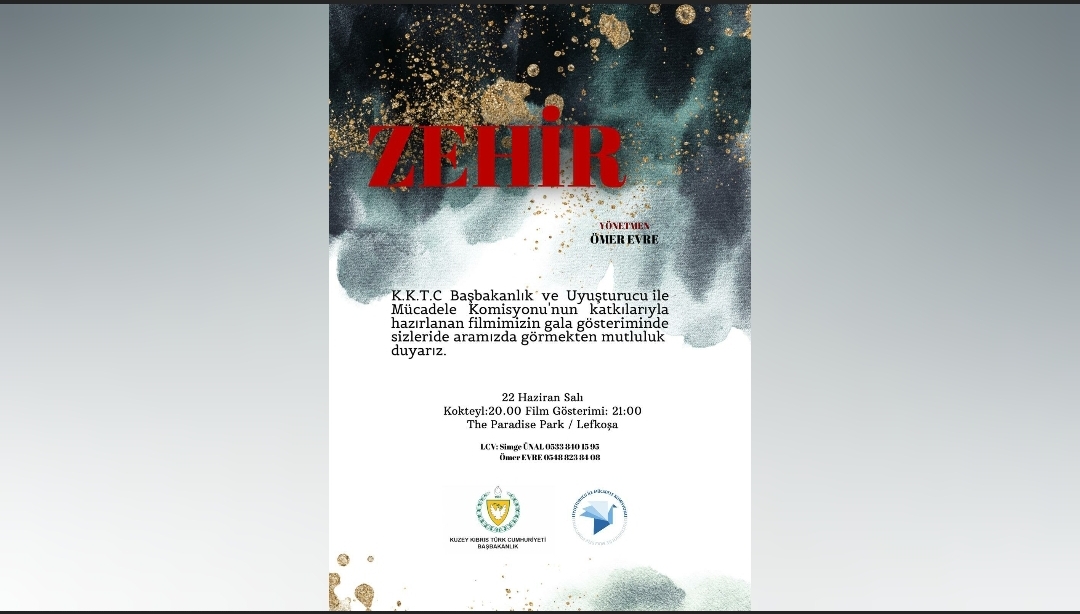 KKTC Başbakanlık ve Uyuşturucu ile Mücadele Komisyonu’nun katkılarıyla hazırlanan “Zehir”filminin gala gösterimi 22 Haziran Salı akşamı yapılacak.